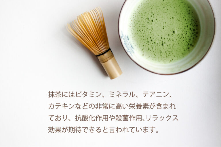 抹茶にはビタミン、ミネラル、テアニン、カテキンなどの非常に高い栄養素が含まれており、抗酸化作用や殺菌作用、リラックス効果が期待できると言われています。